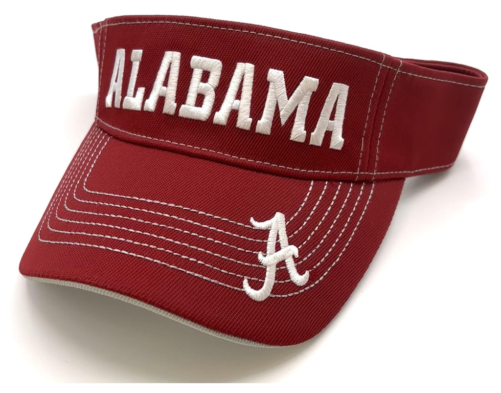 Officially Licensed Alabama University Visor Hat Classic Embroidered Team Logo Adjustable Sun Cap. Design features the always classic university team logo embroidered on the front panel with an adjustable strap closure on the back. This is a limited edition style that is perfect for yourself and the true Alabama fan in your life.