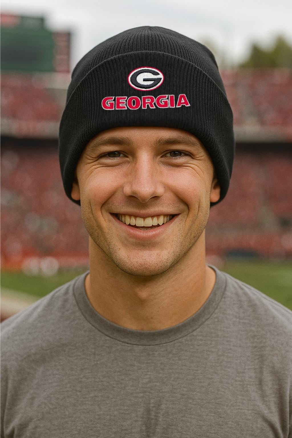 Officially Licensed Georgia Bulldogs Cuffed Knit Beanie Hat. Design features the always classic university team logo embroidered on the front panel on classic comfortable beanie cap. This is a limited edition style that is perfect for yourself and the true Georgia fan in your life.