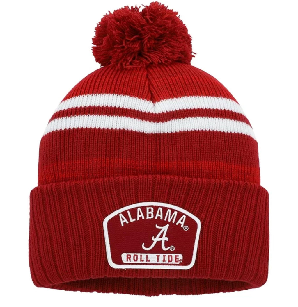 Officially Licensed University Alabama Cuffed Knit Pom Beanie Hat Classic Edition Team Log Cap. Design features the always classic university team logo on the front panel on classic comfortable beanie. This is a limited edition style that is perfect for yourself and the true Alabama fan in your life.